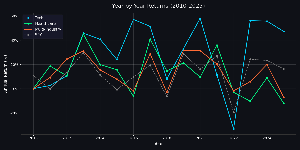 - Single-sector concentration is penalized. Even with the best sector in the market (Tech), you take on dramatically more drawdown risk. The 2022 bear hit Tech MPT for -38.1%.