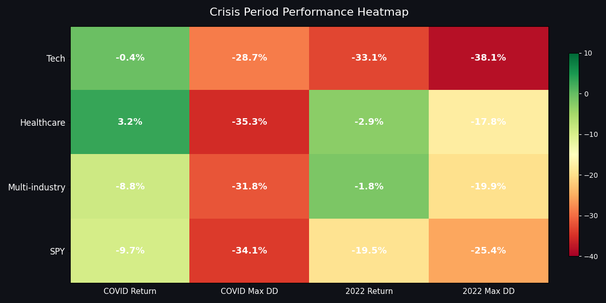 The one advantage: crisis protection. During 2022, Healthcare lost only -2.9% (max drawdown -17.8%) while SPY dropped -19.5% (max drawdown -25.4%). During COVID, Healthcare returned +3.2% while SPY returned -9.7%. If you value capital preservation during crises, Healthcare MPT delivers. But do not expect it to generate meaningful alpha.
