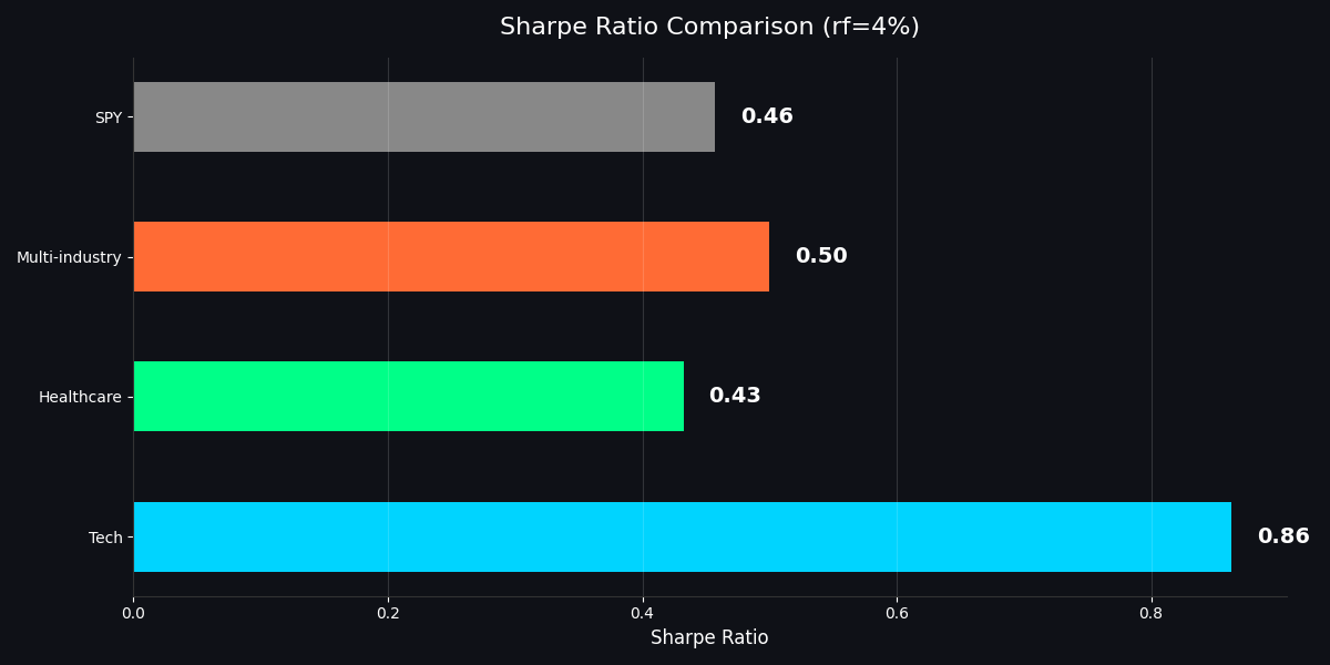 The standout: Tech MPT achieved a Sharpe ratio of 0.86 — nearly 2x the S&P 500's 0.46 — with a 26.4% CAGR. Multi-industry delivered 12.5% CAGR with the lowest volatility (17.0%) and best drawdown protection (-31.8%), edging out SPY on a risk-adjusted basis (Sharpe 0.50 vs 0.46).